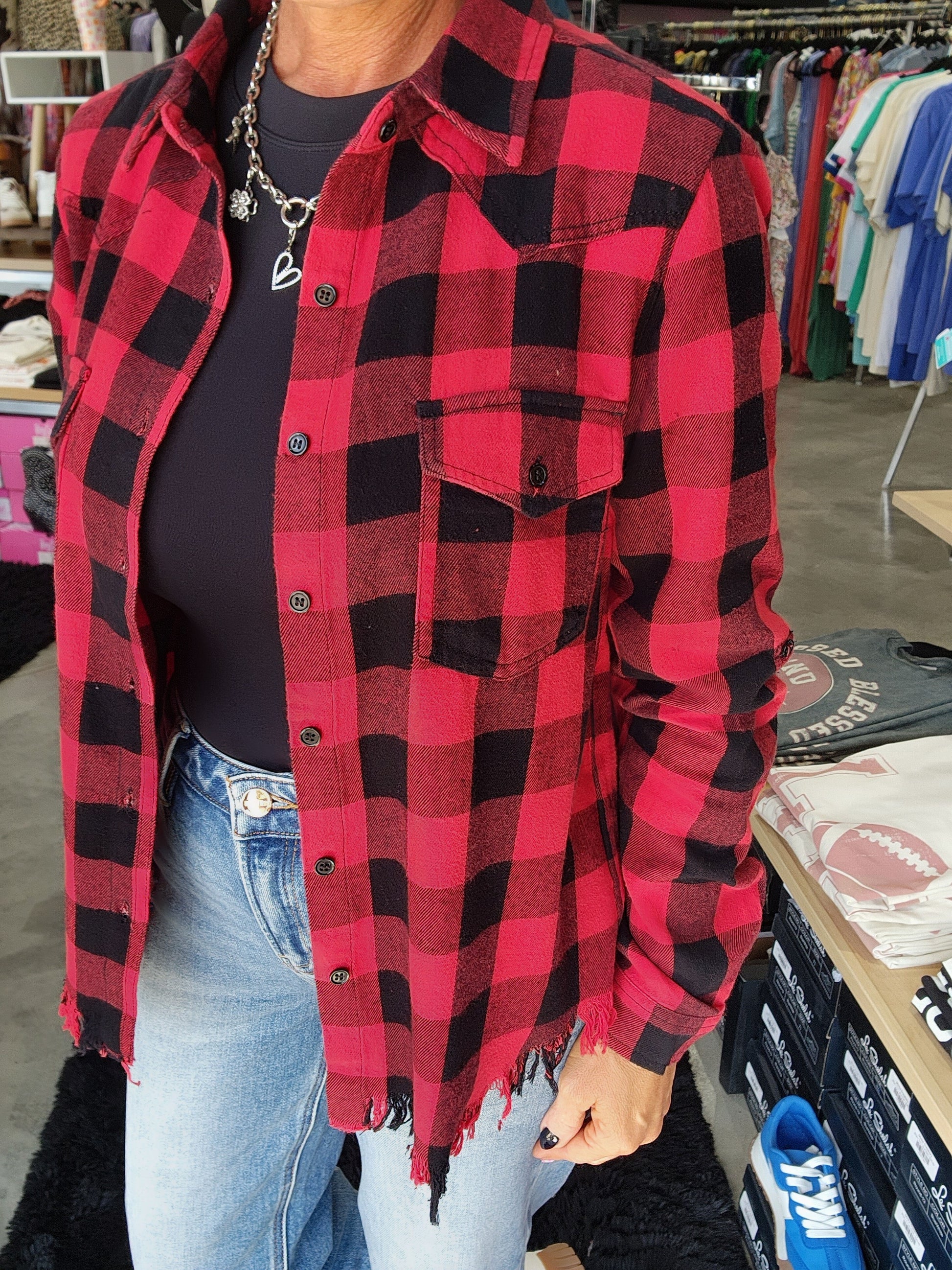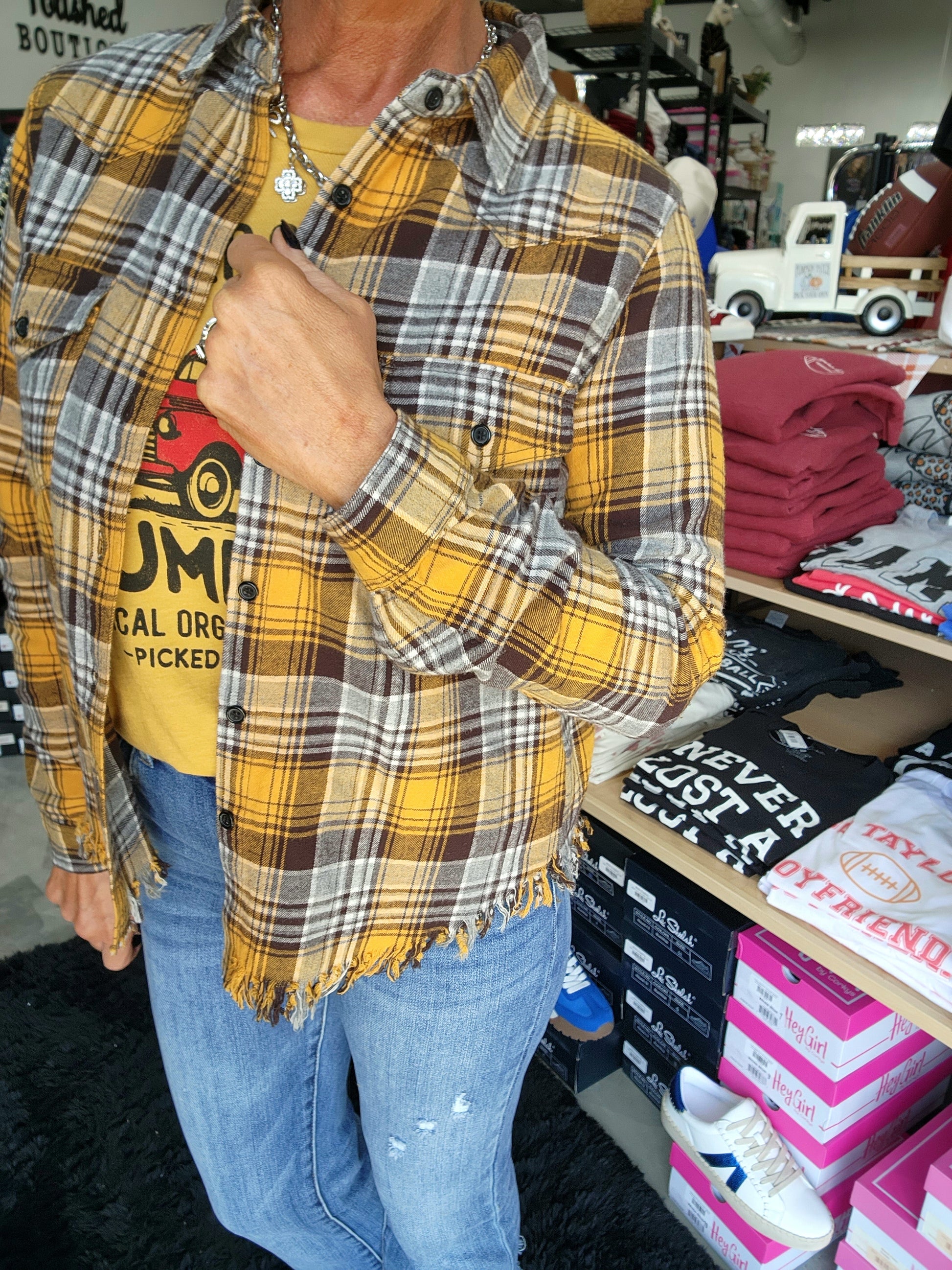 The Raw Edge Flannel adds a fun twist to your casual look with its playful frayed hem. Available in sunny yellow and classic red, this button-up lets you roll the sleeves with convenient buttons for an easygoing vibe. Wear it open over your favorite tee or tank, or button it up for effortless style that’s ready to roll wherever you go.