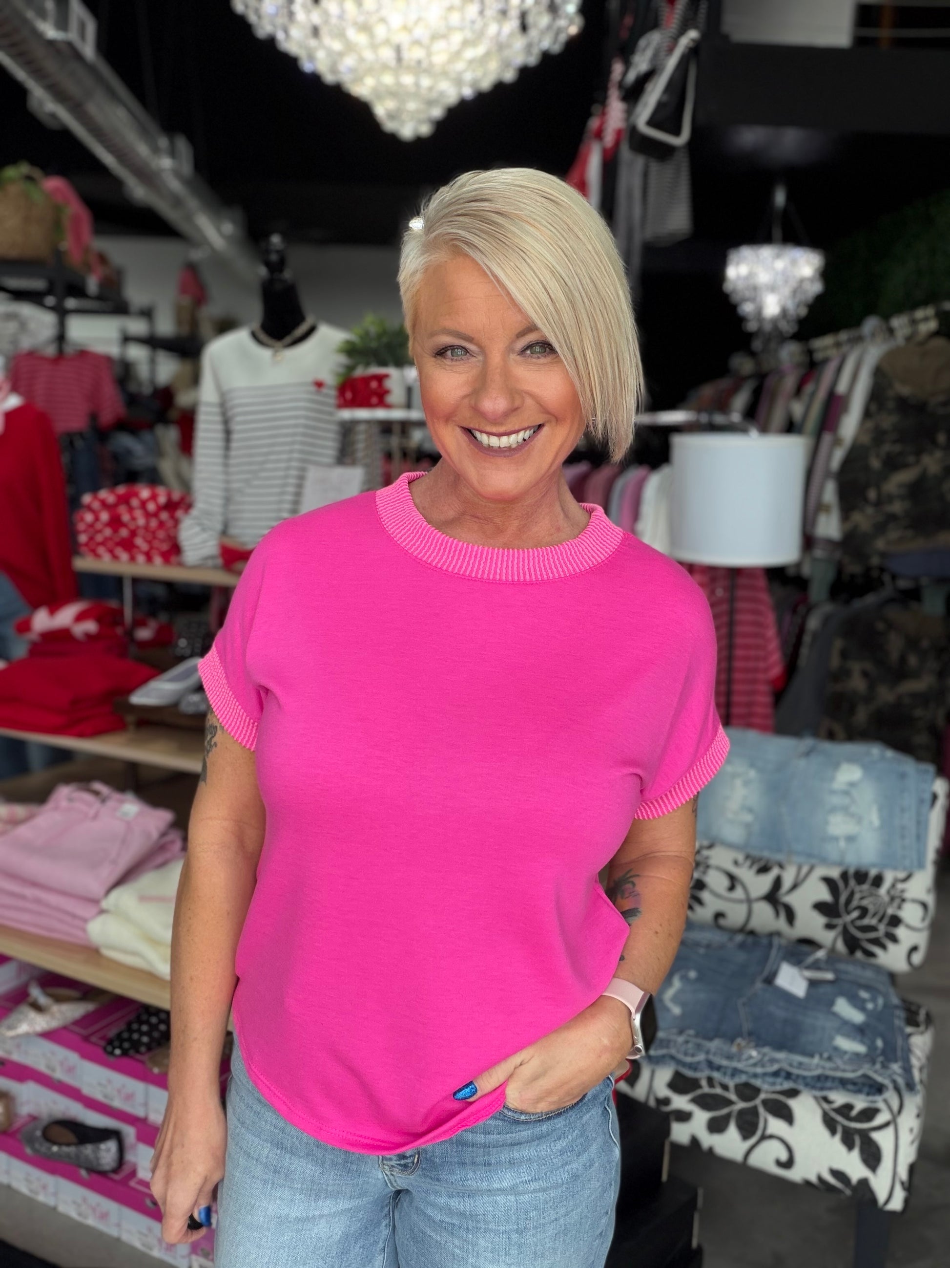 The Sarah Tee features a stylish solid tee with a ribbed neck and sleeve detail, adding texture and visual interest to its classic design. The ribbed accents provide a subtle contrast, enhancing its modern appeal. Perfect for casual or dressy occasions, this top combines comfort and chic sophistication effortlessly.