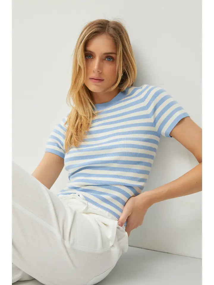 This Sloane Classic Striped Top features a timeless striped print, a classic crewneck, and a slim fit for a flattering silhouette. Made with a soft and comfortable knit fabric, this short sleeve sweater is designed to be waist length and ribbed for added comfort. Elevate your wardrobe with this stylish and versatile top.