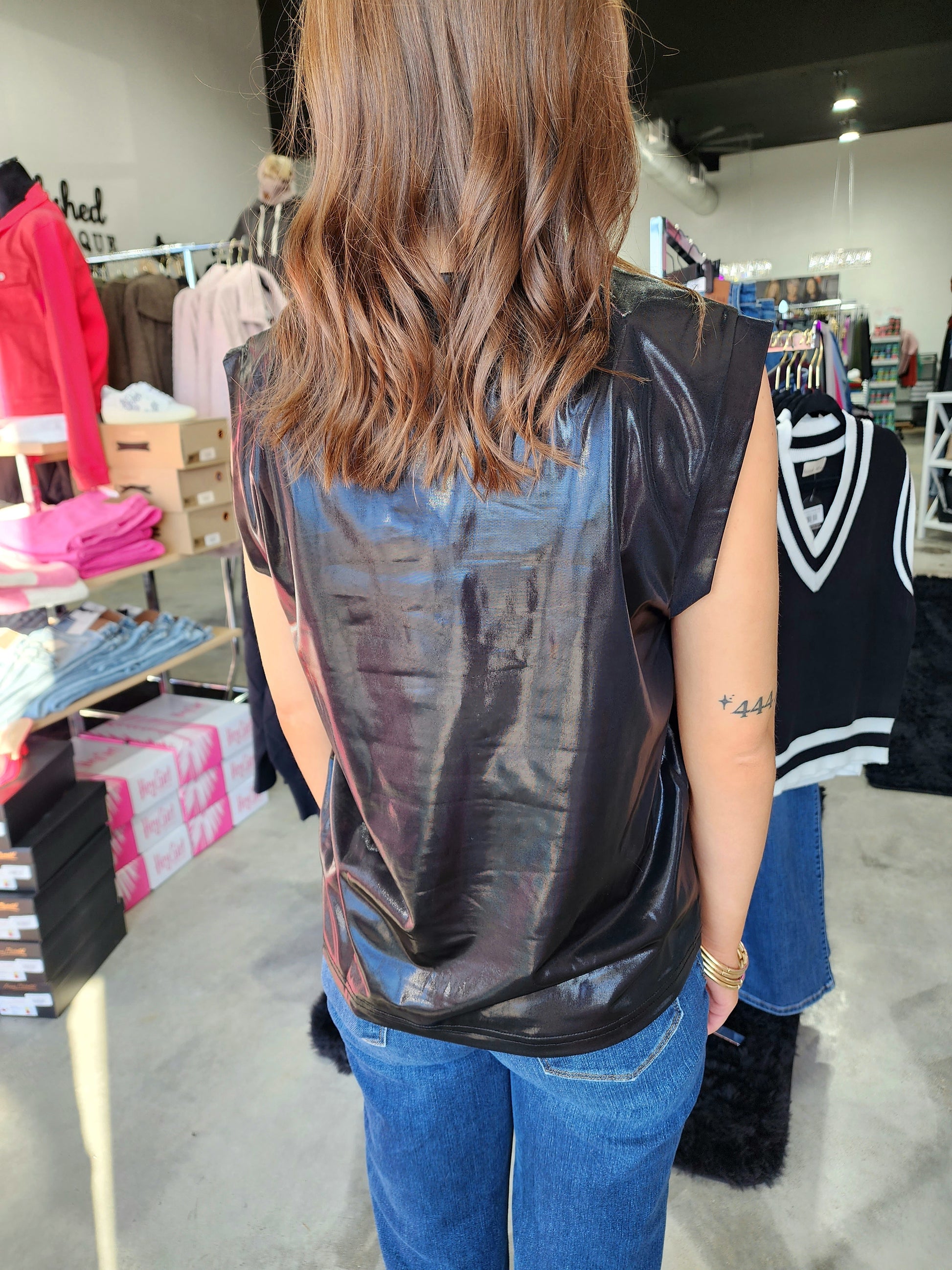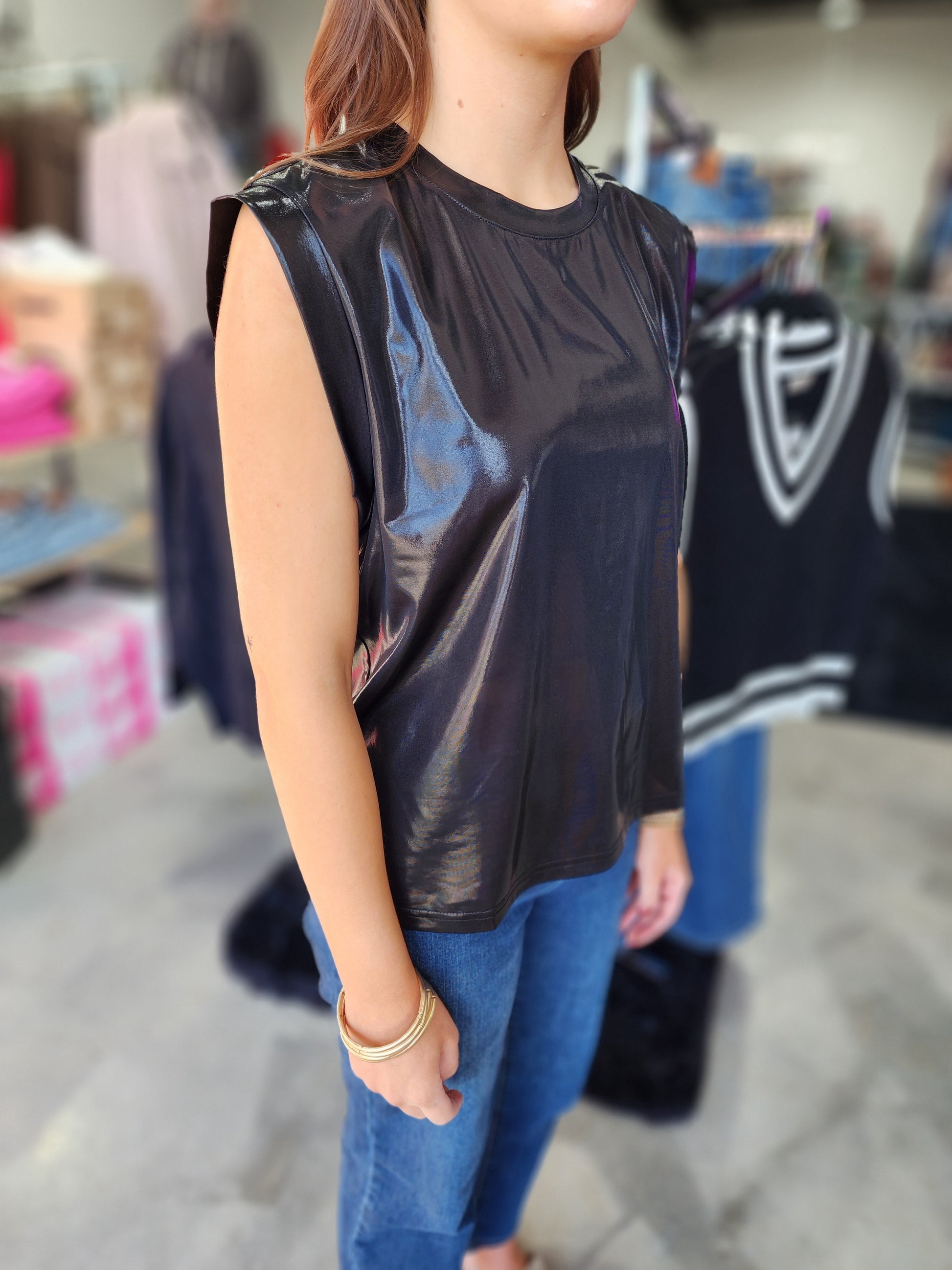 Rock the night away in style with The Starlit Sleeveless Top. This shimmering black top will elevate any outfit and is perfect for nights out, concerts, or a romantic date. Shine bright and stand out in this must-have piece.