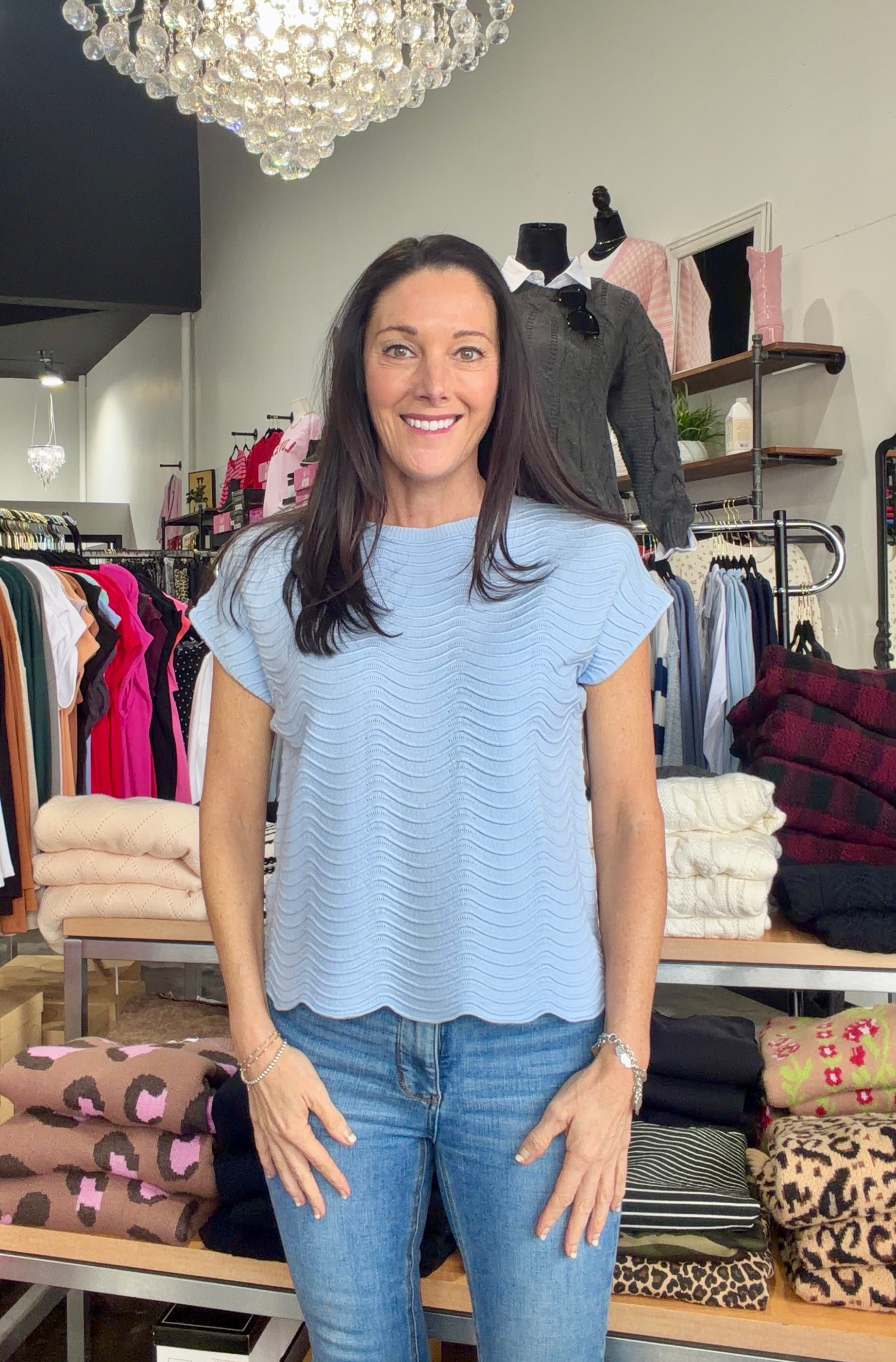 The Wendy Sweater brings effortless charm to your spring wardrobe with its delicate scallop pattern and breezy short sleeves. The classic round neckline keeps things timeless while the textured details add a flirty touch perfect for layering or wearing solo. Light, breathable, and undeniably cute.