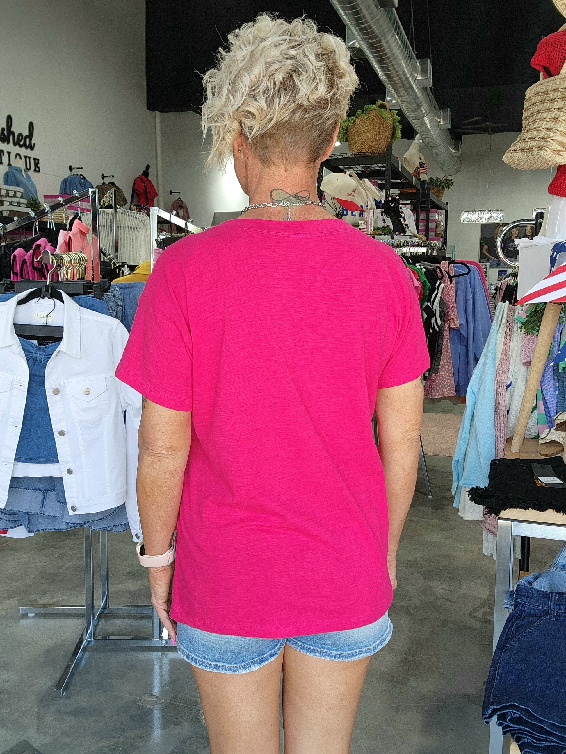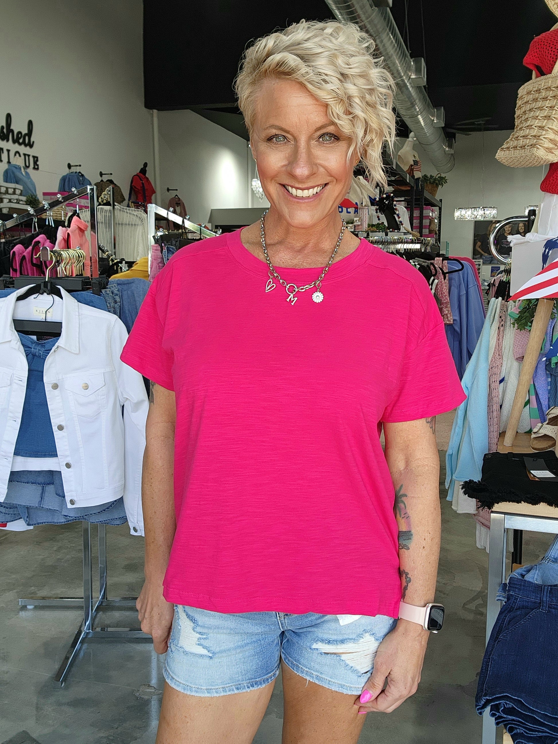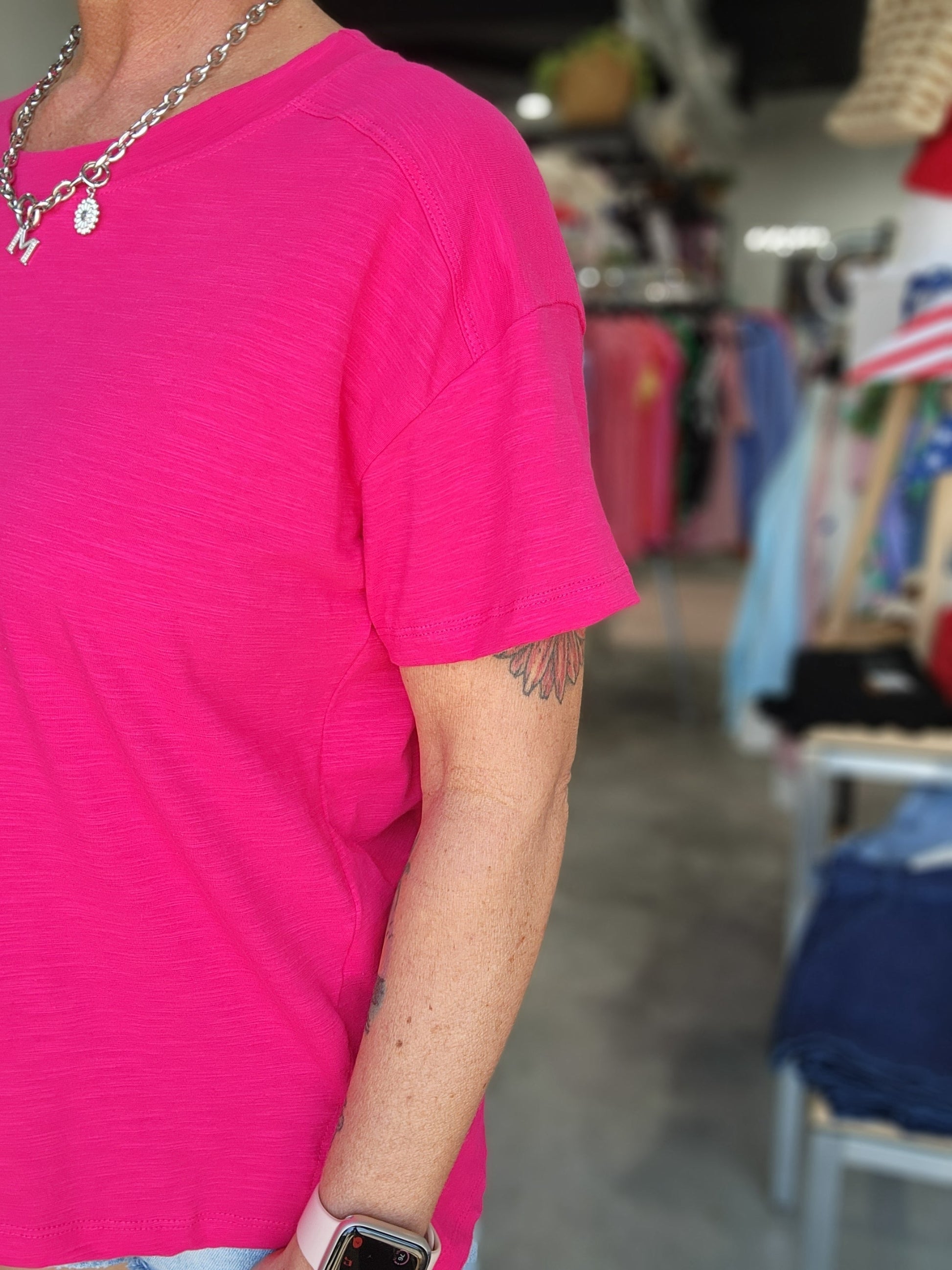 Introducing the Think Pink Top - the perfect addition to your wardrobe! Featuring a vibrant hot pink color and a relaxed fit, this t-shirt style top is both stylish and comfortable. With side slits at the bottom, it's the perfect choice for any occasion.