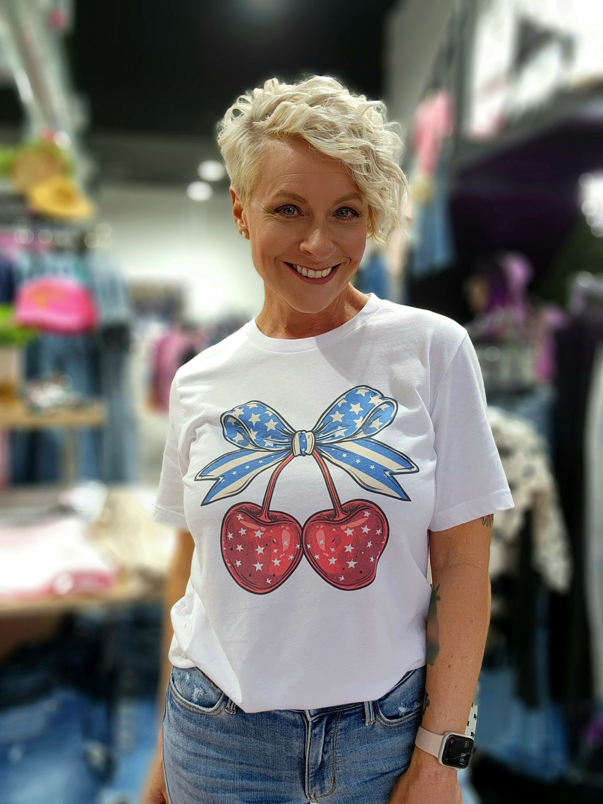 Introducing our USA Bow T-shirt, designed for those who value both comfort and style. Crafted with soft, cozy materials, this tee is perfect for lounging at home or stepping out with casual flair. The vintage sublimation print adds a touch of nostalgia, reminiscent of classic Americana. With its relaxed fit our USA Bow T-shirt offers the perfect blend of comfort and patriotism, making it a versatile addition to any wardrobe. Wear it on patriotic holidays, during outdoor adventures, or simply whenever you want to show your love for the USA in style.