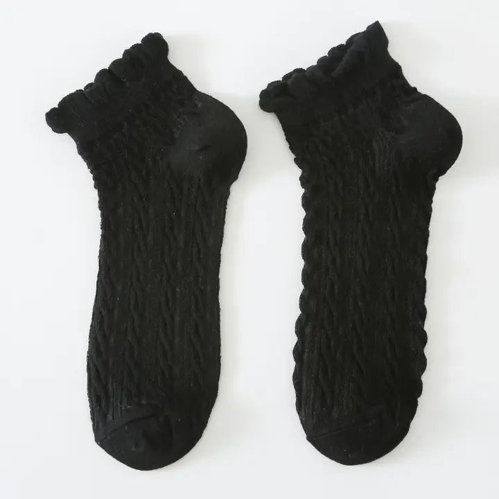 Elevate your sock game with these Women's Mesh Twist Ruffle Ankle Socks, designed to add a subtle yet stylish touch to any outfit. Crafted for comfort and a delicate fit, the ruffled edge gives a refined charm perfect for both casual and dressy looks. Experience everyday sophistication with a playful twist in these versatile, trend-right accessories.