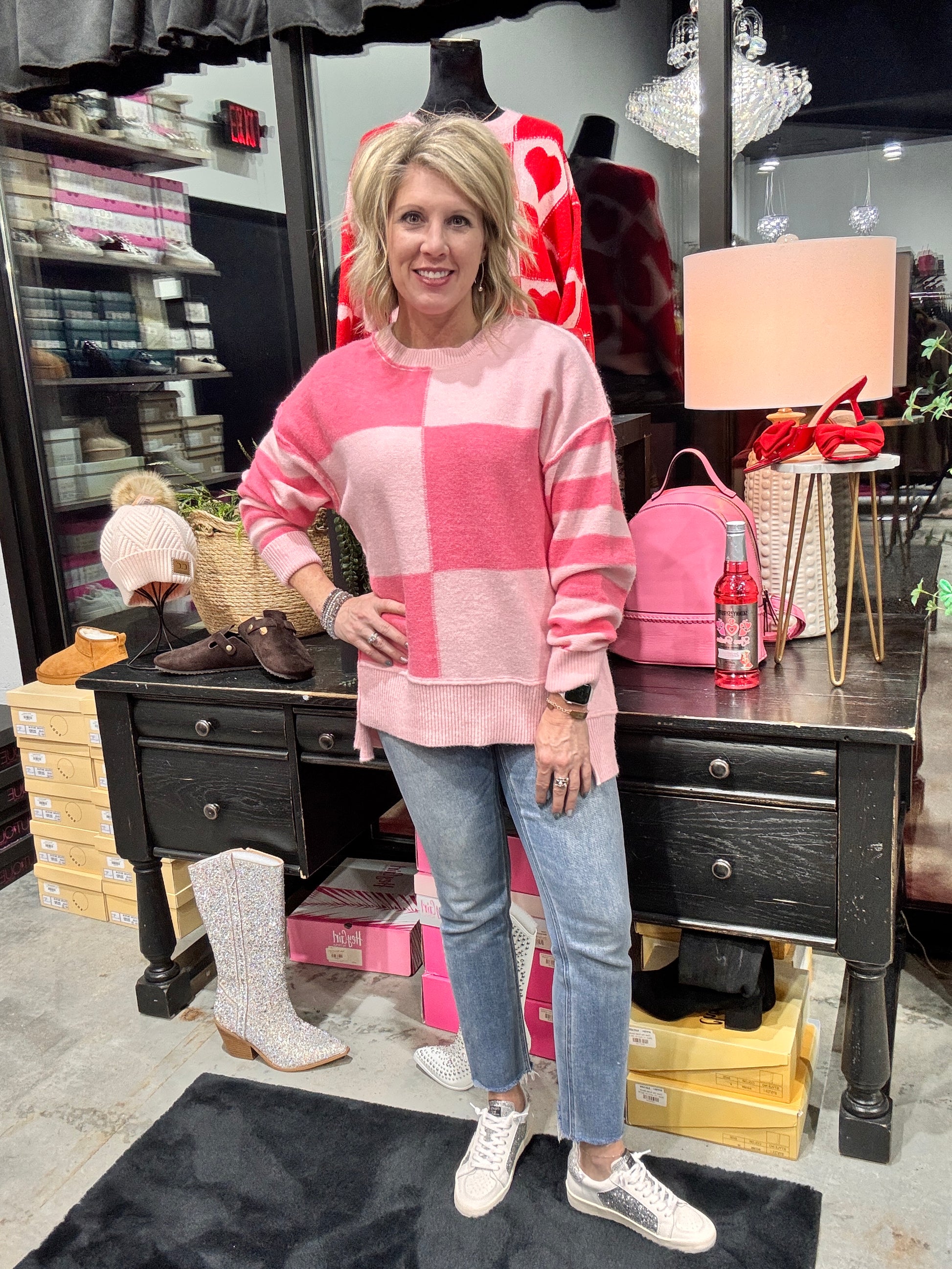 Introducing You're All I Pink About, the perfect addition to your wardrobe. With its trendy color blocking and striped sleeves, this top is both cute and comfortable. The high-low hem adds a touch of sophistication to any outfit. Elevate your style with this must-have piece.
